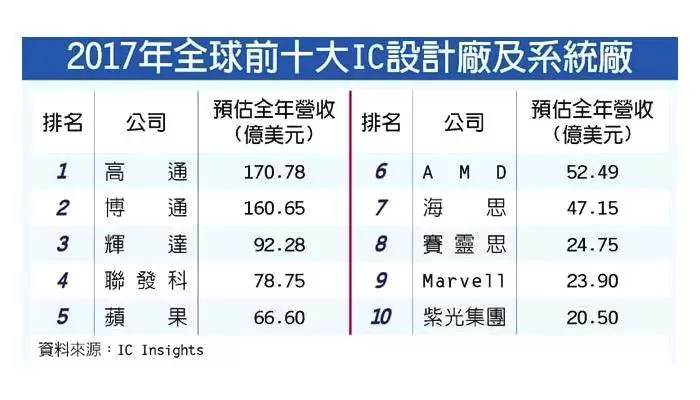 根据知名IC芯片企业调研机构IC Insights在2017年公布的全球10大IC设计公司营收排名,其中有三家总部位于大中华区的IC设计公司跻身前十,分别是联发科技、海思半导体与紫光,其中联发科以去年营收约78.75亿美元的成绩排名第四,而海思半导体的营收约为47.15元排名第七,至于紫光则综合了包括展讯和锐迪科在内的业绩跻身前十,所以实际上海思和联发科这两家企业成为了在美系芯片巨头环伺市场格局下的两股清流。