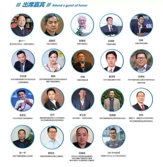 大会将汇集来自政府、学界、行业协会、国内外标杆企业的千余名嘉宾代表,共商全球物联网发展、探讨物联网产业未来。南方科技大学校长陈十一、中国工程院院士孟建民、中科院院士姚建铨等知名专家;中国互联网新闻中心总编辑王晓辉、深圳市物联网智能技术应用协会会长刘志雄、深圳市物联网智能技术应用协会创始会长、蜂群产服集团董事长戴梅、高通全球副总裁孙刚、浪潮集团高级副总裁肖雪等将出席大会;同时,ARM、思科(Cisco)、Google、甲骨文(Oracle)等国内外知名企业高管也将悉数到场,共襄盛会。