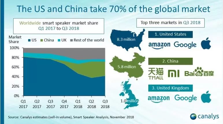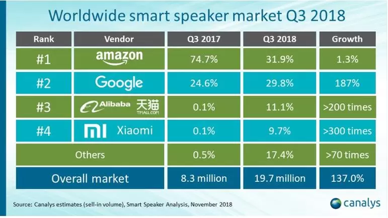 2018年第三季度智能扬声器出货量同比猛增,亚马逊一路领先。据研究公司Canalys称,亚马逊和谷歌之间的战斗推动美国和其他一些主要市场的智能扬声器销量增长。与此同时,百度,阿里巴巴和小米正在争夺中国市场的巨大增长。