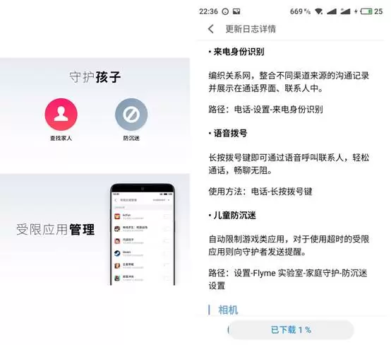 在Flyme 7上,安全家庭升级为家庭守护,新加入了一个儿童防沉迷功能。父母可以把孩子手机中的某些应用设置为受限应用,限制其使用的时间,一旦超过该时常,可实现远程强制退出。即使孩子偷偷下载了新的游戏应用,Flyme 7也可以自动识别将其归入受限应用。这一功能对于父母来说很有意义,可以实现对孩子的保护和关爱。
