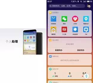个人助理是Flyme 7中新增的全新智能服务模块,基于One Mind的智能分析能力与京东、菜鸟裹裹、百度地图、饿了么、梦享网络、信析宝等11家服务商进行了合作,为用户带来16个场景下的快捷服务。用户通过在桌面上滑或是长按Home键即可轻松呼出个人助理。