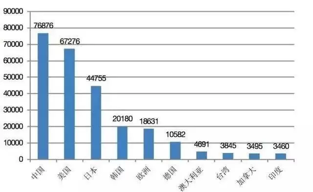 在报告中,中国以专利申请量76876位居榜首,其余排名前十位的国家/地区依次为美国(67276件)、日本(44755件)、韩国(20180件)、欧洲(18631件)、德国(10582件)、澳大利亚(4691件)、中国台湾地区(3845件)、加拿大(3495件)和印度(3460件)。