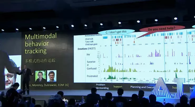 我们来看一些更加具体的研究。这是我同事正在做的,让人可以跟计算机产生互动。这个系统可以做到每一秒都在追踪人类的面部表情和语音,从而推断出这个人的情感状态,荧幕上的红点在不断地移动,反映的是这个人的情感状态。当系统推断出学生存在沮丧和消极的情绪,这时老师就会介入提供帮助。当老师与学生一同将问题解决时,系统检测到了学生的积极情绪。