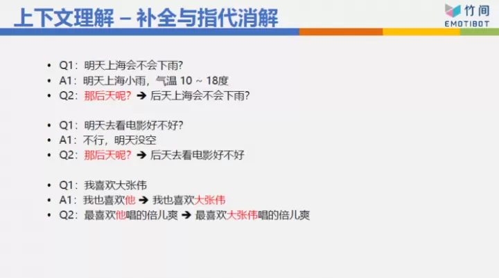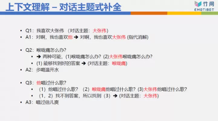 第一个是上下文理解技术,有三种方式:补全、指代消解和对话主题式补全。
