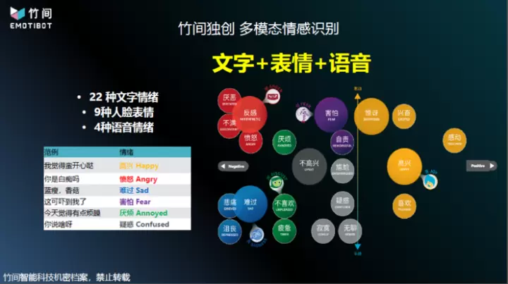 我们公司的 EMOTIBOT 是一个情感机器人,光文字情绪就做了 22 种,人脸表情 9 种,语音情绪 4 种,此外,还做了多模态情感识别。