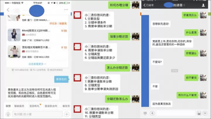 先看一下人机交互目前的现况:第一个,双十一快到了,我在系统推荐了三件 T 恤后,回答「要黑色的」,大家可以看一下图左边智能客服的回答,竟然在介绍黑色的基本定义。第二个例子是与某家知名银行的智能客服的对话。最后这个例子就有点可怕了,这是去年发生的事情,大家可以看下图最右边对话框的对话。