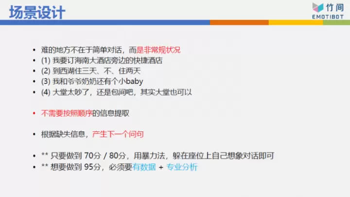 二是语言学家与数据质量。我们在数据标注上非常严谨,花了超过 3 万人/天的人力去做数据表述和检查。在 NLP 的数据专业度方面,我们每年至少投入 1500 万,三年以来,竹间的语言学家都维持庞大的队伍(纯硕士跟博士),目前有近 30 个语言学家。