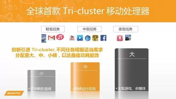 当年联发科Helio X20率先打出10核可谓是震惊业界,但我觉得它的最主要亮点反到不是在十核方面,而是提出了三(多)丛集的概念。联发科X20通过MCSI互联总线把这个十核进行连接,形成三丛集的核心群,CorePilot 3.0的技术文档中有一个Square的排前算法,简单来说就是这个算法会考虑到应用的类别,对应用的特性有一个实时的学习,从而知道这个应用对性能的需求程度,再调用相对应的核心去进行运算,在这个调用的过程中,不同丛集的核心是可以搭配互相使用。