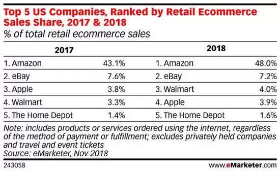 但两者都落后于目前为7.2%的eBay。亚马逊将在2018年占据美国电子商务市场48%的份额,高于去年的43.1%。