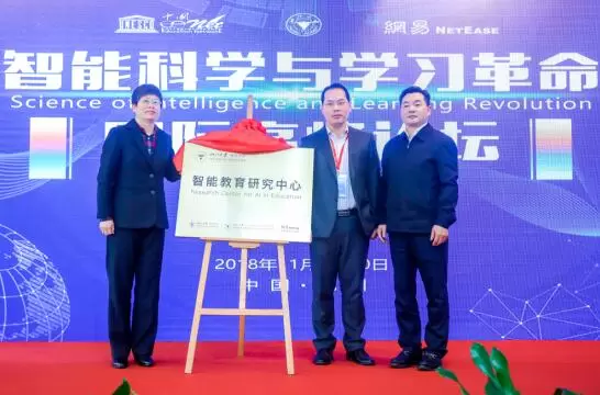 (左起:浙江大学计算机科学与技术学院党委书记彭列平、网易教育事业部总经理蒋忠波、浙江大学教育学院党委书记吴巨慧,共同为智能教育研究中心揭牌)