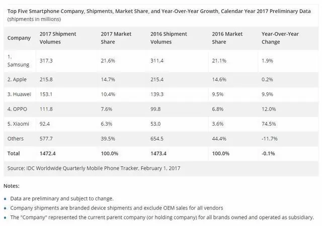 Countpointer数据显示,2017年小米手机累计销售手机9240万台,排名全球第5位,次于三星、苹果、华为和OPPO。