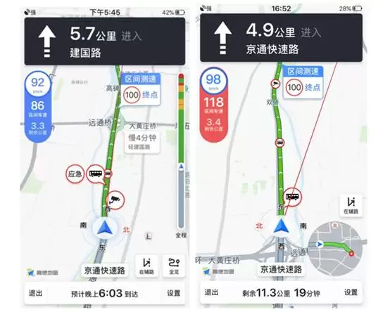 智能化:通过高德地图导航页面可以看到,区间测速控件在导航页面左上角显示,最上方数字为瞬时速度,中间数字为区间测速的区间平均车速,最下方为剩余里程数,高德通过一个导航控件可即可实时展示当下的瞬时速度、平均车速和里程数。