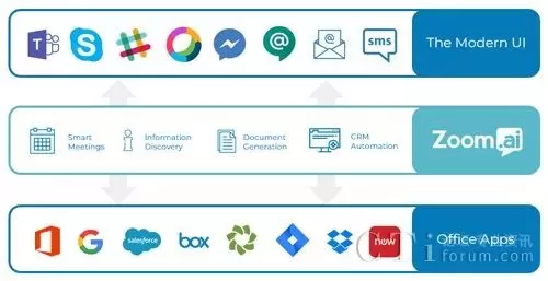 Zoom.ai直接位于公司的聊天平台如Microsoft Teams、Skype for Business、Slack等和企业应用程序如Microsoft Office, Salesforce, Dropbox等之间。四个核心产品被设计成可以简单的部署和设置和进行自动化管理任务。