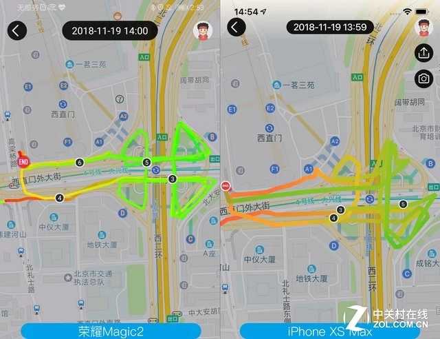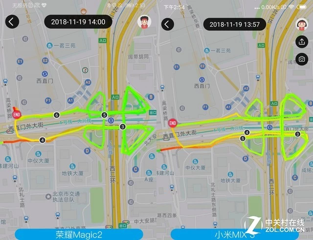 我们使用荣耀Magic2和小米MIX3进行了对比,我们骑着电动车,来到了传说中的“世界第九大奇迹”西直门立交桥进行了GPS实测。