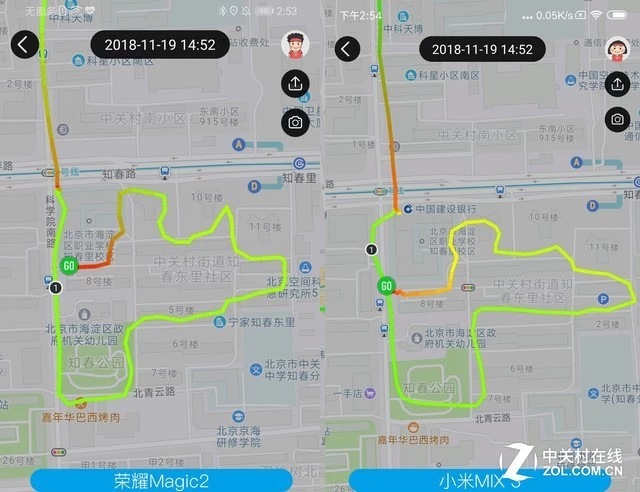 荣耀Magic2与小米MIX3路线GPS路线对比