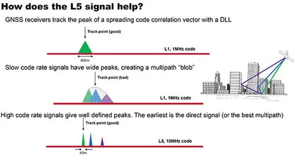 这也让L5频率在反射之后的错误信号和正确的直射信号更不容易混淆,使得计算引擎更容易找到直射卫星信号,从而有效提高了定位的精度。