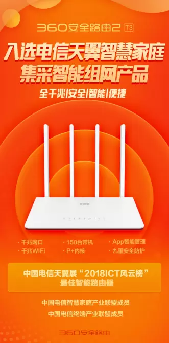 以“黑客级别安全,极致网络性能”为要求的360安全路由2 T3现已入围电信天翼智慧家庭集采智能组网产品,成为中国电信全千兆双频智能无线路由首推。