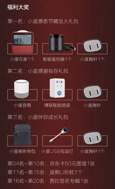 “小度小度,感恩节快乐”“小度小度,我想看感恩节的电影”“小度小度,谢谢”…即日起-11月25日,不限口令与小度多多互动,产生亲密值最高的前20名用户,将成为“小度2018感恩回馈排行榜”幸运用户,获得小度感恩节精品大礼包。用户还可以与小度产品互动,说出指定感恩节彩蛋口令,拍摄小视频带挑战话题#小度感恩节#,上传微博或抖音平台并@小度小度,就有机会赢取包括DOSS音箱、小度手提袋、小度棒球帽等在内的惊喜好礼!同时,小度还在“百科专区”“有声专区”上线感恩节的习俗、感恩节音乐专辑、感谢爱人的电影等内容,感恩用户相伴。