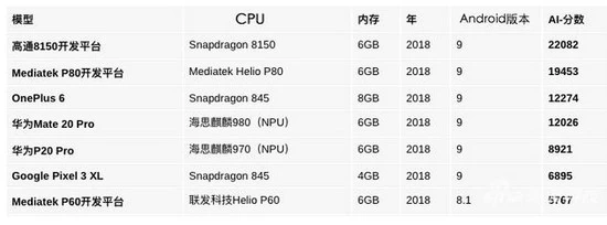 Geekbench用高通8150原型、以及搭载麒麟980处理器的华为Mate20系列、使用骁龙845处理器产品进行测试发现,8150的AI性能稳居榜首,麒麟980处理器的得分居然落后于骁龙845处理器。