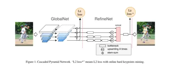 那么旷视提出的CPN是如何实现的呢?俞刚说大体在于一个two-stage的模型架构:GlobalNet和RefineNet(见下图),这是一种top-down pipeline,先通过检测器检测出图像之中的人,再把每个人抠出来并做单人姿态估计,最后把结果整合到原图上。CPN这种两阶段架构设计的想法其实也不复杂,甚至可以说是相当朴素直观,来源于人是怎么识别人体关键点,即由特征金字塔网络GlobalNet先识别出简单关键点,再由(借助online hard keypoint mining loss的)RefineNet整合来自前者的特征表征以识别余下的困难关键点。这样从易到难,层层推进,最终克服了关键点难以识别的问题。