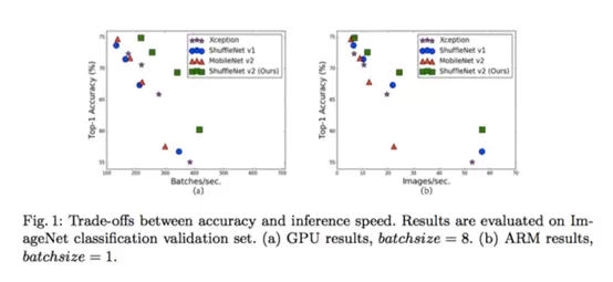 不同于侧重准确度高效的(给定计算量下的准确度)轻量级卷积神经网络(L-CNN),ShuffleNet v2是一种侧重执行高效的(给定速度下的准确度)的新架构,而相比于MobileNet v2和ShuffleNet v1,ShuffleNet v2同时在GPU和ARM上显著提升了准确度/执行速度之间的权衡(参见下图)。