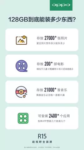 那么拥有一台128GB内存的OPPO R15可以干嘛?可以装下多达27000+张照片、也或是21000+首歌曲、也或是200+部高清电影。超大的存储空间,不仅是满足了用户需要更多存储空间的需求,更为重要的是为用户带来了安全感。