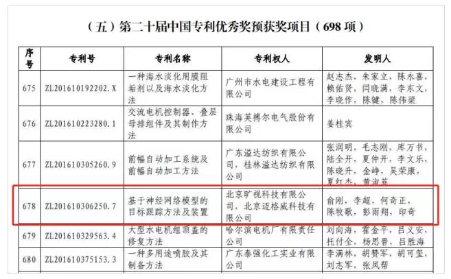 2018年11月23日,据国家知识产权局公布的第二十届中国专利奖评审结果显示,由北京旷视科技有限公司提交的“基于神经网络模型的目标跟踪方法及装置”的发明专利(专利号ZL201610306250.7)成功通过此次评审,荣获第二十届中国专利优秀奖。