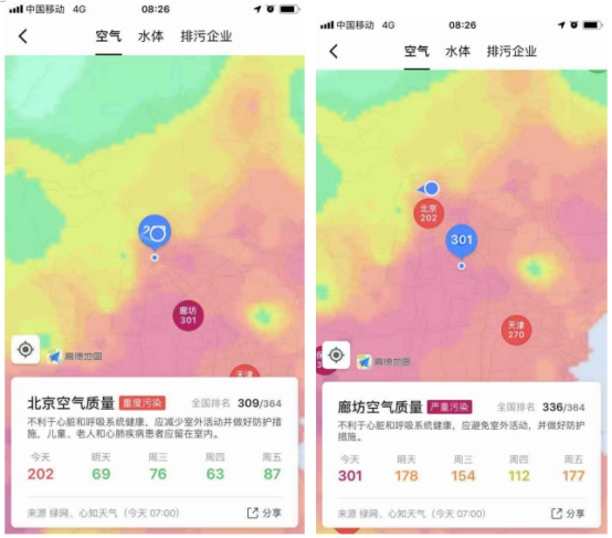 记者查看高德地图环境地图也看到,11月26日早上8时左右,北京空气质量指数为202,属于重度污染,26日空气情况会加重,预计指数为173;同期,河北廊坊为严重污染,空气质量指数336;天津空气质量也为重度污染,空气质量指数为270,不利于心脏和呼吸系统健康,应减少室外活动并做好防护措施.