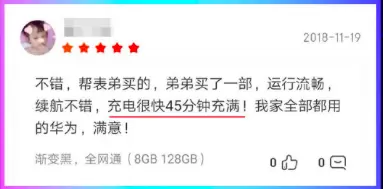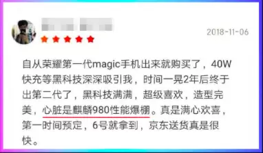 从购机用户评论来看,消费者对荣耀Magic2的40W超级快充、麒麟980反应速度和超广角AI三摄三大卖点赞不绝口。