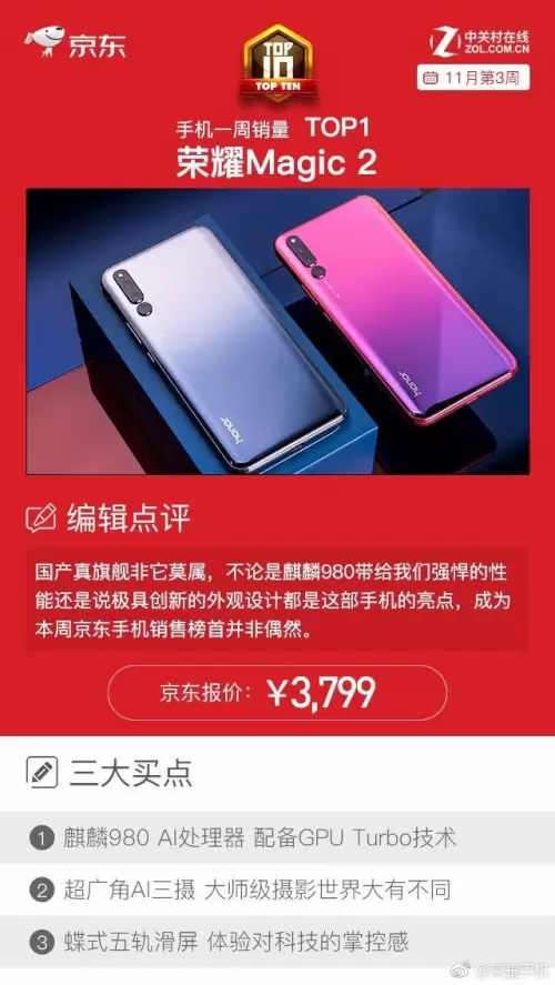 - 荣耀Magic2 麒麟980+40W快充获狂赞,11月27日再次全版本开售