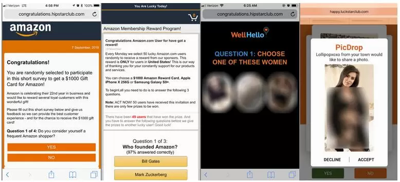 他说,恶意广告的制作看起来像官方Android应用程序(play.google.com)的广告,但实际上,它们被设计为劫持iOS美国用户并将其重定向到ScamClub的成人和礼品卡诈骗,其中骗子试图通过欺骗性的优惠收集用户的个人和财务数据。
