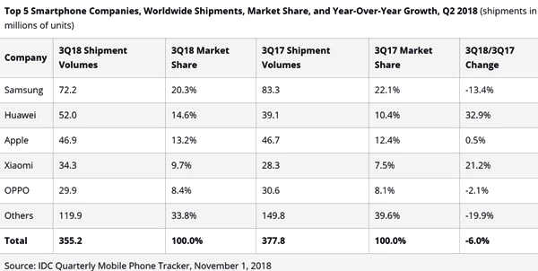 全球手机出货量持续下滑已然是个不争的事实,根据知名市场调研机构IDC的数据来看,今年第三季度全球范围内智能手机的出货总量为 3.552 亿台,相较一年前同时期有 6% 的跌幅,创下全球智能手机市场连续第四个季度下滑,行业整体不景气已然成为摆在台面上的现实。