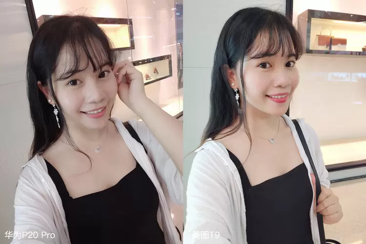 华为P20 Pro镜头下的小姐姐肤色白润,中级美颜的磨皮效果不会过度,所以肌肤看起来会有一些颗粒感;美图T9中级美颜的成像效果已经很精致了,肌肤有种吹弹可破的状感觉,唇色也得到色度提升,并且画面以亮光为主,整个画面色彩的宽容度很高。