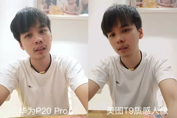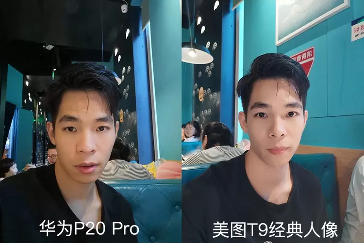 在餐厅偏暖光灯场景下,华为P20 Pro人像处理容易偏黄,不过这一来美颜处理后的状态也比较写实;美图T9光线平衡感还蛮强,出片效果的画面色调还能保持偏白皙的质感,五官甚至都处理得更为精致,比如鼻翼的缩小,肌肤美颜后的样子让小哥哥自己都乐了。