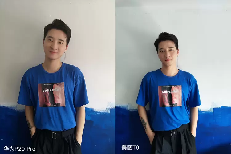 在偏白灯光的环境下,华为P20 Pro肤色就比较自然了,很接近真实状态,而美图T9这边选择了质感人像模式拍摄,所以照片画面视觉效果会有一种雾面感,肌肤处理也以暗沉为主,质感不错,主要看个人喜好吧这个风格。