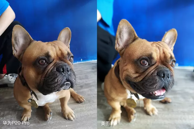 狗狗可以明显看出色差,其中华为P20 Pro拍出的效果与真实狗狗色调更接近,因为华为不支持动物美颜啦;而美图T9美颜系统竟然可以识别到狗狗,有点让人不可思议,所以拍出的色彩得到提升,看起来就比较鲜艳些。