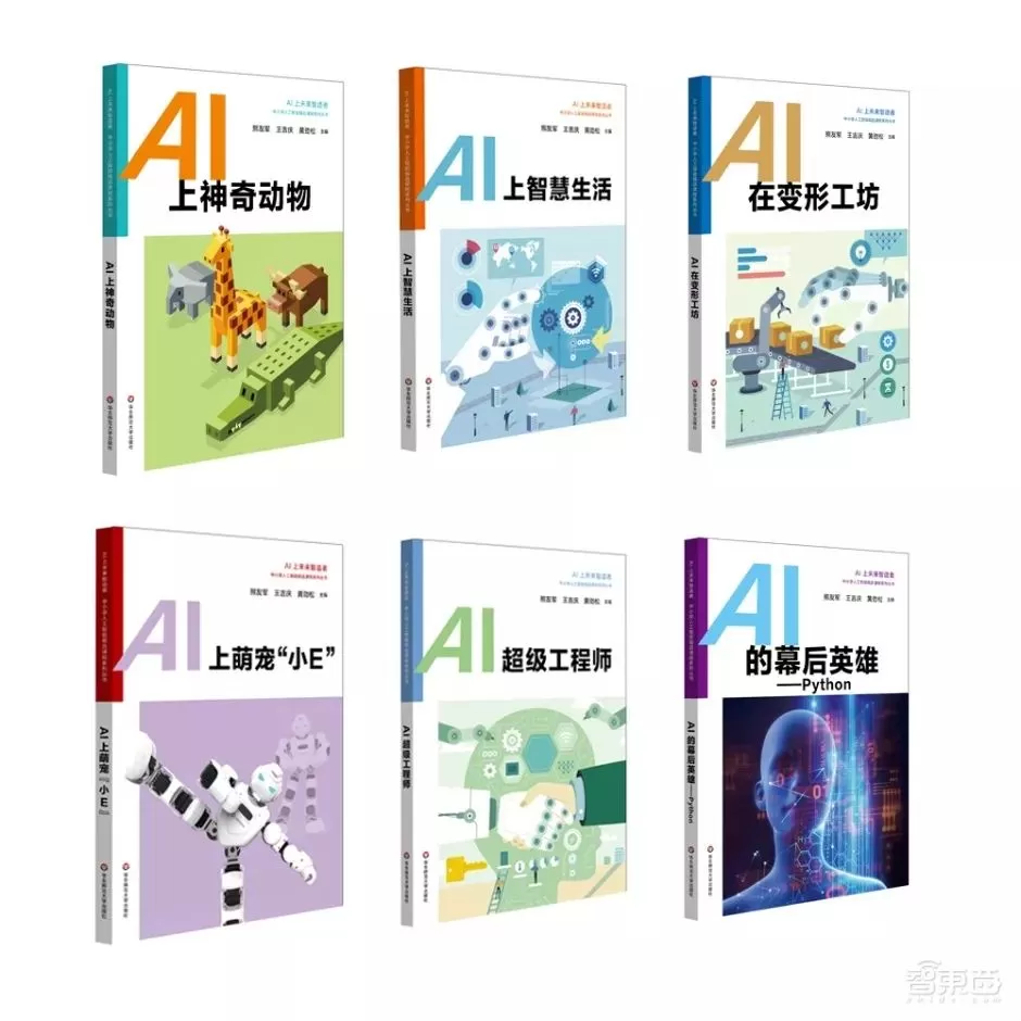 这套丛书共包括十册,目前已经出版的六册分别为:《AI上神奇动物》、《AI上智慧生活》、《AI在变形工坊》、《AI上萌宠“小E”》、《AI超级工程师》和《AI的幕后英雄——Python》,另外四册将于2019年出版。