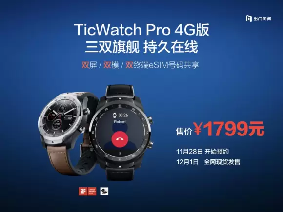 2018年11月28日14:00-15:00,AI语音赛道独角兽公司出门问问正式通过线上发布会推出全球首款拥有4GeSIM一号双终端版本的“大三双”全能旗舰TicWatch Pro 4G版,打造智能手表行业标杆产品。TicWatch Pro 4G版售价1799元,发布会当日开启预售,12月1日正式通过出门问问官网、天猫、京东及全国各地线下小问之家现货发售。