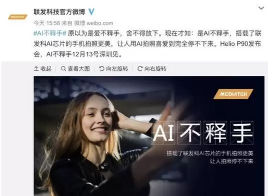 11月30日下午,联发科官方微博发布消息,将于12月13日在深圳发布最新的Helio P90处理器,而从联发科的文案「AI不释手」来看,Helio P90将在AI和拍照方面发力。