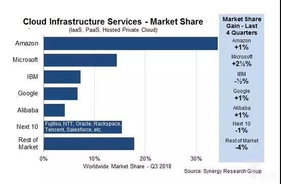 市场份额也印证了AWS的业绩。根据Synergy Research的数据,亚马逊的AWS控制着34%的云基础设施服务市场。微软以15%的市场份额位居第二,其次是IBM(第三)和谷歌(第四),市场份额均为个位数。