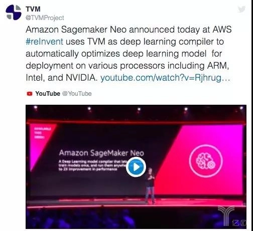 发布会上还有一点值得注意,那就是亚马逊云的完全托管端到端机器学习服务AWS SageMaker,将采用陈天奇团队的TVM 作为自动优化深度学习模型的框架编译器,后端支持ARM、英特尔和英伟达的硬件。