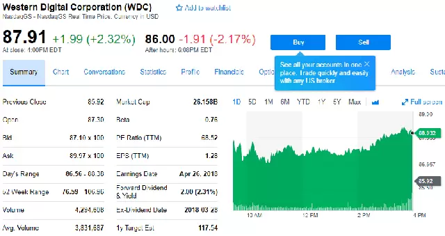 今天常规交易中,西部数据股价上涨1.99美元,报收于87.91美元,涨幅为2.32%;盘后交易中,截至美国东部时间18:08(北京时间早上6:08),西部数据股价下跌1.91美元,跌幅为2.17%。过去52周,西部数据股价最高为106.96美元,最低为76.59美元。