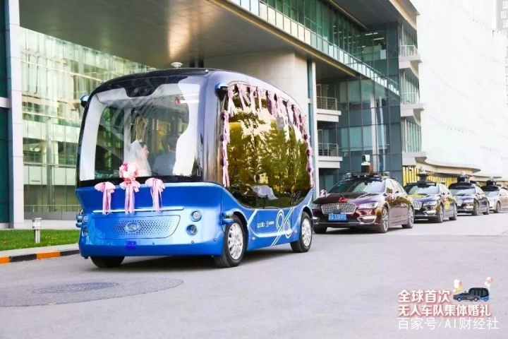 今年的程序员节,百度大厦举行了一场特别的婚礼,三名新郎都是Apollo的工程师小哥,在这个特殊的日子里,他们召唤无人车组成了一支特别的迎亲队伍,想要给妻子一个惊喜。以阿波龙为车首的队伍霸气十足,百度总裁张亚勤成了他们的证婚人,李彦宏还特地给新人们录制了一段视频。