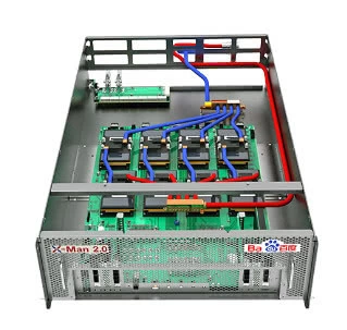 X-MAN2.0发布于2017年Q3,通过冷板式液冷散热技术实现了超高的散热效率。和业界主流方案一样,X-MAN2.0可以支持8卡NVLink高速互联,差异化方面,X-MAN2.0具备2大技术特征:液冷散热和灵活的IO支持。随着AI加速卡的功耗增长,散热问题已成为制约AI加速卡计算力提升的关键瓶颈,X-MAN2.0通过冷板式液冷散热技术解决了散热难题,同时又避免了浸没式液冷技术带来的运维、部署、成本等问题。随着AI加速卡的性能进一步提升,通信瓶颈也会进一步暴露,X-MAN2.0通过灵活的IO接口特性,支持按业务场景适配不同数量的100G RDMA网卡,在解决多机加速的可扩展性技术挑战的同时,也有效降低了网络系统设计的复杂度和成本。