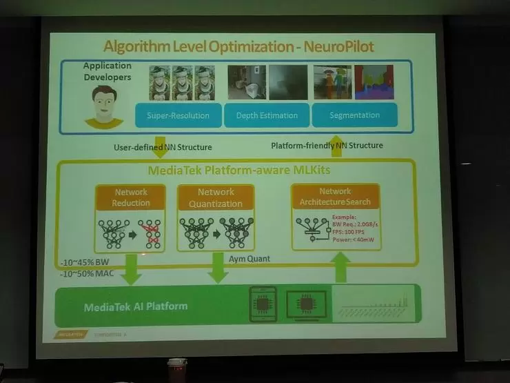 吴骅重点介绍了NeuroPilot 2.0相对前代的改进,联发科在NeuroPilot 2.0平台上提供了ML Kit,可以对神经网络进行剪枝和量化,经过Quant(量化分析),可以节省35%的运算量和25%~30%的带宽,同样准确度并不会下降。