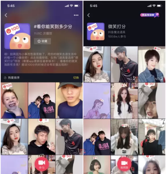 背后的原因,是抖音最近推出了一款名为“微笑打分”的特效道具。网友录制视频时,只要选了这款道具,人脸上方就会自动弹出一个分数,系统随后通过人脸识别技术不断调整打分,网友笑得越开心,分数就会越高。