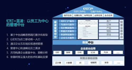 蓝凌董事长杨健伟指出:中台战略驱动下的数字化转型,整合企业后台应用(ERP、SCM等)和云基础设施,结合数据中台、业务中台、管理中台,全面赋能前台实时在线化,快速响应客户、员工的需求,敏捷应对市场的快速变化。