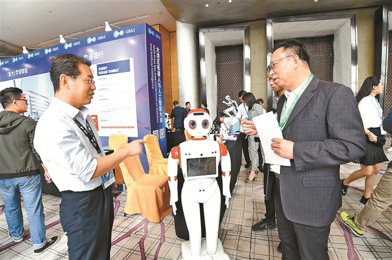 昨日,2018大湾区机器人与人工智能大会在深圳前海万豪酒店举行,粤港澳大湾区9+2城市群有关领导应邀出席。大会以“AI产业化·产业AI化,迈向创新经济新时代”为主题,国内外知名院士专家、上市公司高管、投融资机构、专业观众等约计3000人次参加活动。图为城市漫步机器人吸引了众多参会嘉宾前来咨询了解。