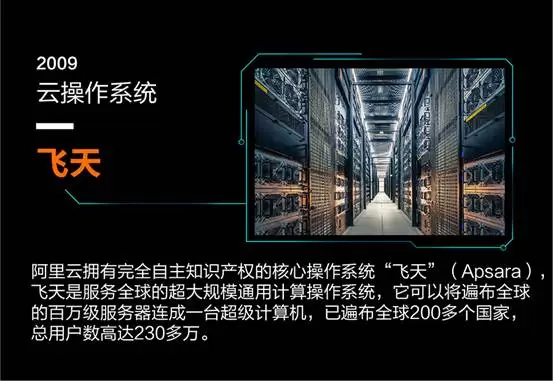 阿里云拥有完全自主知识产权的核心操作系统”飞天”(Apsara),飞天是服务全球的超大规模通用计算操作系统,它可以将遍布全球的百万级服务器连成一台超级计算机。单集群可达1万台规模,10万个进程达毫秒级响应,十亿级文件数,EB级别存储空间。目前“飞天”已遍布全球200多个国家,总用户数高达230多万。2017年天猫“双11”全球狂欢节当天,飞天创下了世界纪录,实现了每秒32.5万笔交易峰值,每秒25.6万笔支付峰值。