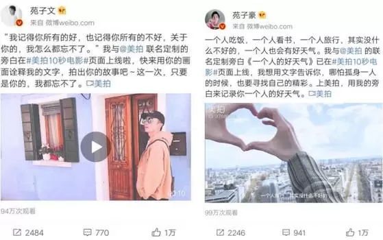 4月24日,北大男神、畅销书作家苑子文在美拍发布“10秒电影”,向粉丝发起号召:“快来用你的画面诠释我的文字,拍出你的故事吧。这一次,只要是你的,我都忘不了。” 随后弟弟苑子豪也分享了以自己为“男主角”的短视频,邀请网友使用美拍“10秒电影”定制旁白《一个人的好天气》:“我想用文字告诉你,哪怕孤身一人的时候,也要寻找自己的精彩。上美拍,用我的旁白来记录你一个人的好天气。”